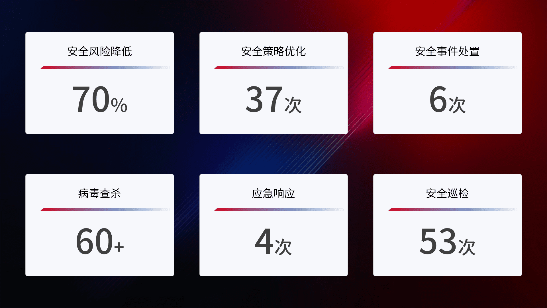 提供全面的安全事件报告体系,,,包括处置报告、、、、周报、、季度和年度总结,,,,结合持续监控,,,帮助客户深入了解网络安全状况。。。。
