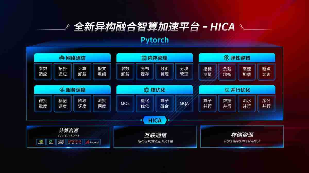 通过自研的服务层、、中间适配层、、、以及调度编排算法,,,采用数据并行、、、模型并行等多种并行方式,,,,把并行计算任务进行有效的分解,,,,使其分别由相应的软件栈和算力资源来承接。。。当GPU资源变化,,,HICA可以实时动态调度计算子任务并调整模型拓扑和架构,,,以充分聚合各种算力资源。。